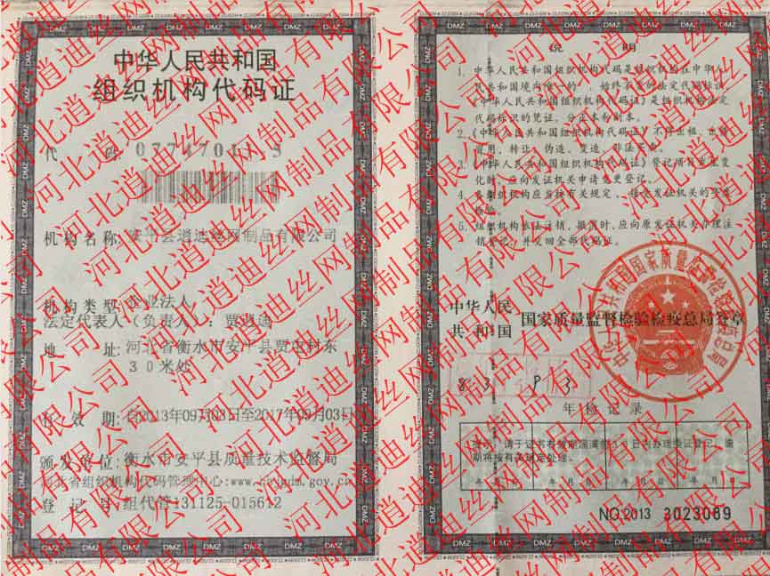 河北逍迪絲網制品有限公司老證件現在都是三證合一沒有此證了,但是目前還有客戶需要次證件