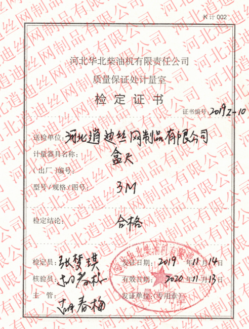 河北逍迪絲網制品有限公司-檢定證書盒尺