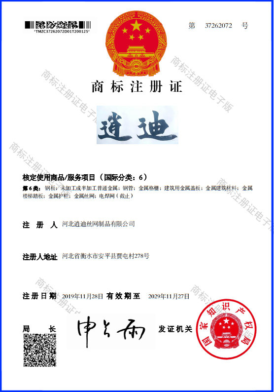 河北逍迪絲網制品有限公司商標注冊證,第372620722號 國際分類第6大類鋼板:未加工或半加工普通金屬;鋼管;金屬格柵;建筑用的金屬蓋板;金屬建筑材料;金屬樓梯踏板;金屬護欄;金屬絲網;電焊網(截止)發布機關國家知識產權局商標注冊證電子版本